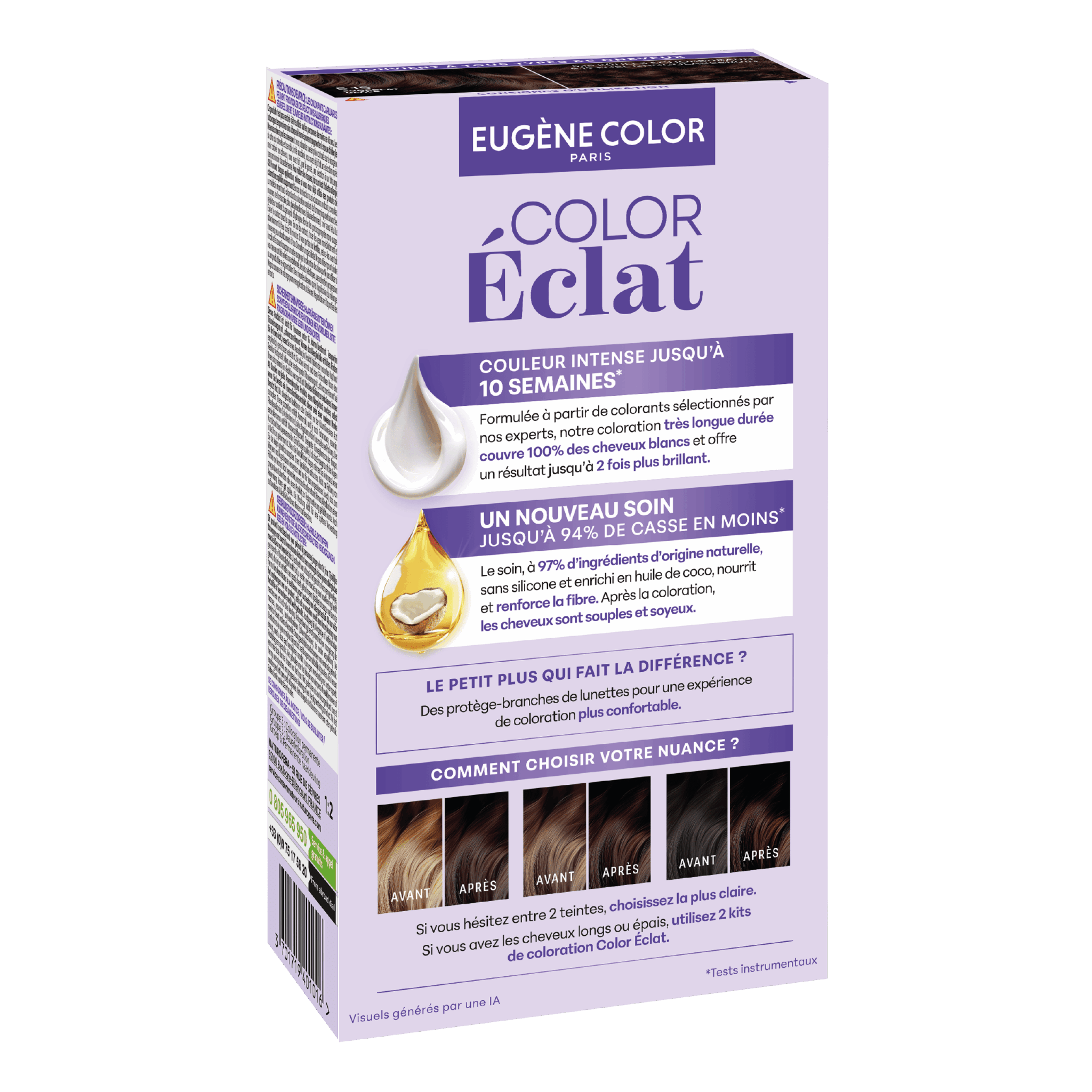 Avant d’appliquer votre coloration, il est nécessaire de faire un test d’allergie 48h avant chaque application. Vous devez suivre scrupuleusement toutes les étapes détaillées sur la notice présente dans le kit de coloration Eugène Color pour obtenir un résultat parfait.