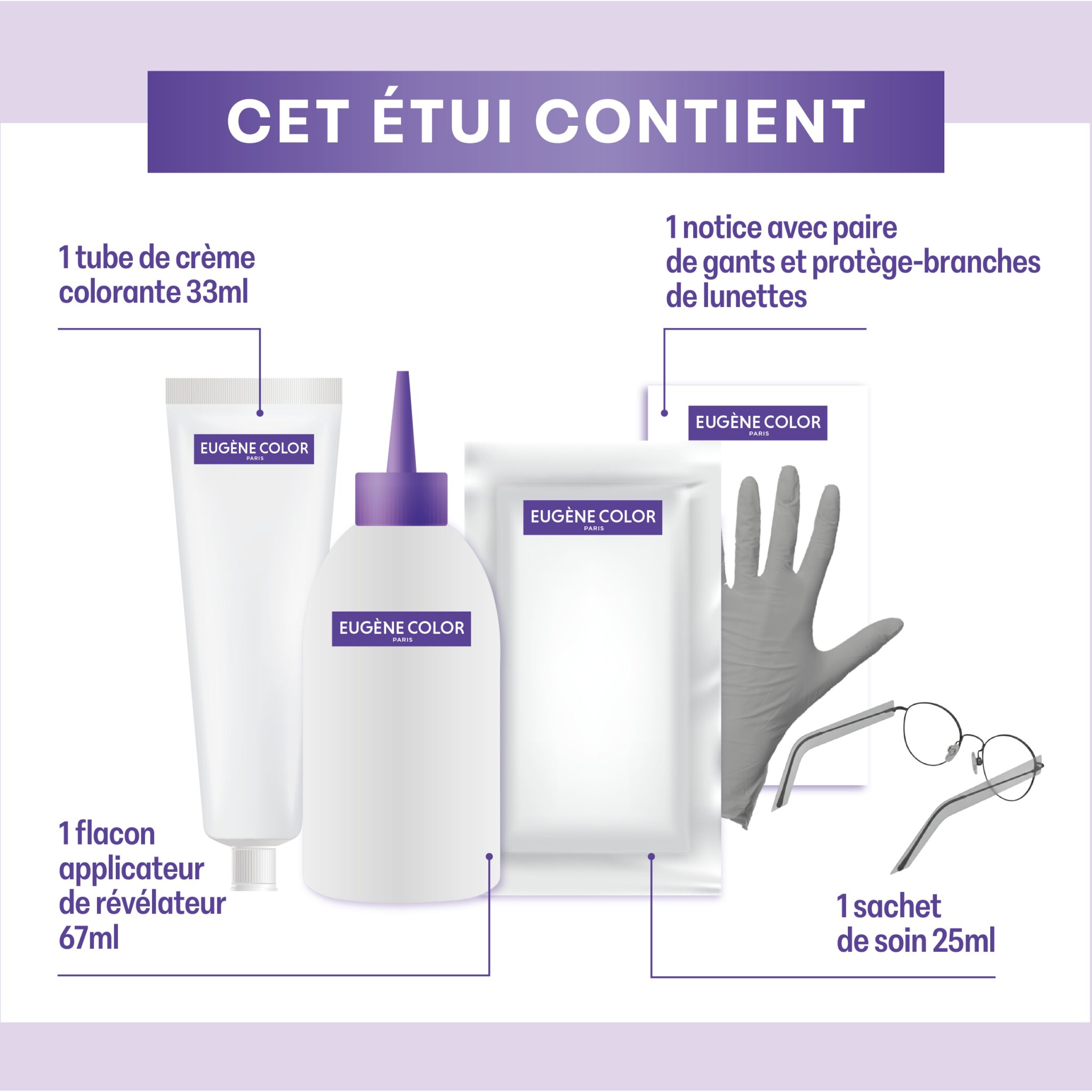 Avant d’appliquer votre coloration, il est nécessaire de faire un test d’allergie 48h avant chaque application. Vous devez suivre scrupuleusement toutes les étapes détaillées sur la notice présente dans le kit de coloration Eugène Color pour obtenir un résultat parfait.
